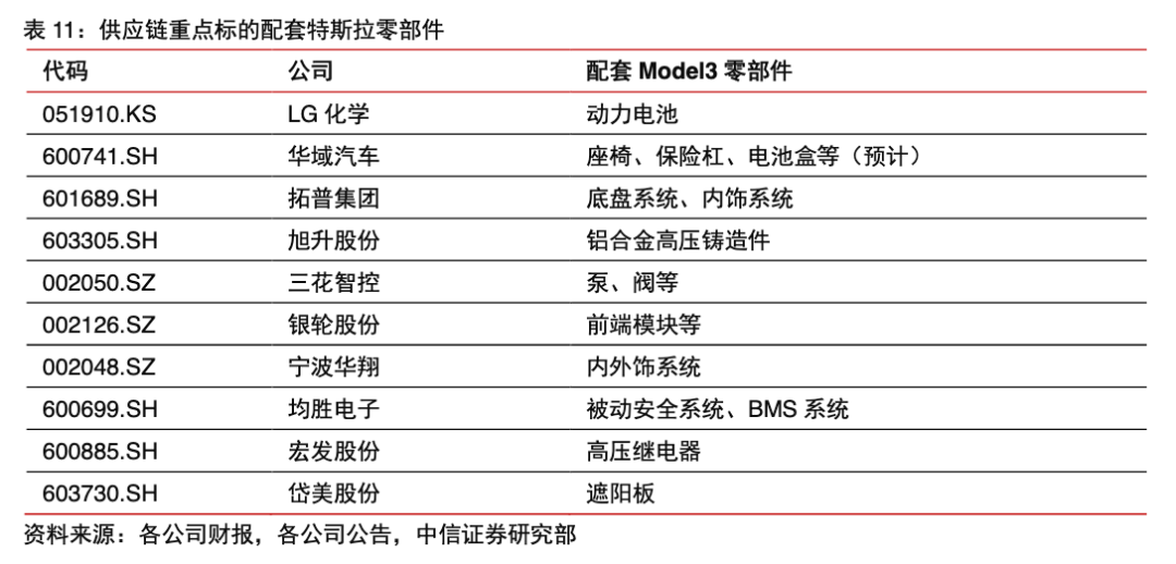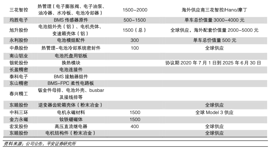 依托中國(guó)成熟、高效的零部件供應(yīng)鏈體系,大量零部件料將國(guó)產(chǎn)化、本地化供應(yīng)。其中:旭升股份、拓普集團(tuán)、三花智控、寧波華翔、華域汽車、岱美股份等單車價(jià)值量較大。