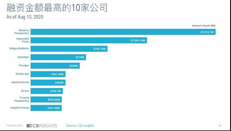 其中,除 Moderna Therapeutics 、Amyris 、Precigen 等公司已成功上市之外,其余 7 家企業(yè)的融資輪次均分布于 D 輪 - G 輪次之間,Zymergen 也于日前對外宣布完成了 3 億美金的新一輪融資。
