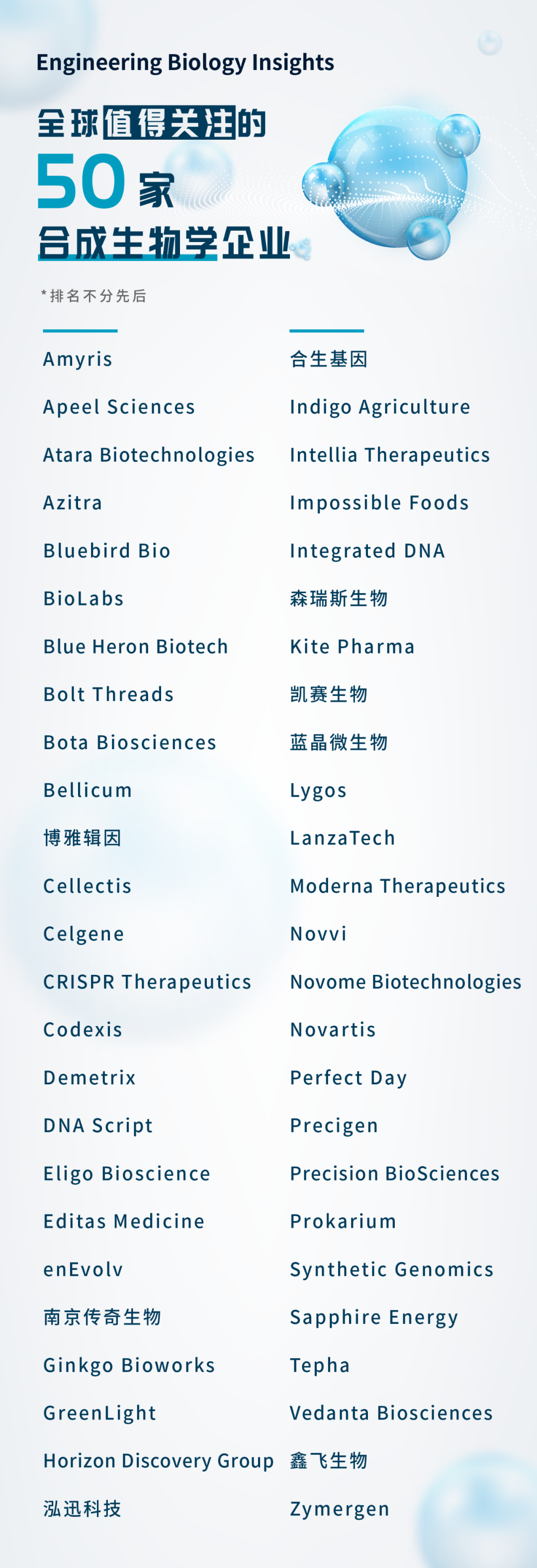 從 CB Insights 的統(tǒng)計數(shù)中不難發(fā)現(xiàn),從 2015 年開始,大批合成生物學相關公司相繼成立。融資階段分布數(shù)據(jù)顯示,2015-2017 年,融資階段主要分為在種子 / 天使輪,3 年平均占比超 35%;而 2018 年至今,融資階段向 A 輪及 B 輪轉移,其中 2020 年 1-8 月,B 輪融資占比已達 33%。隨后,基于 EB Insights 的研究成果,劉炯在會上發(fā)布了 “全球最值得關注的 50 家合成生物學企業(yè)” 榜單,并重點介紹深耕中國本土市場的公司,在他們用 “上帝之手” 譜寫生命奧秘的背后,變革的巨浪早已奔涌而至。立足中國,為了實現(xiàn)可持續(xù)性發(fā)展,合成生物學可以獲得能源、化學等方面的可持續(xù)產品,也能減少環(huán)境污染。而且更重要的是,合成生物學是一門新興學科,雖然目前中國的生物技術整體而言還趕不上發(fā)達國家,但是對于早期階段起步的合成生物學,中國也許能成為這一具有極大潛力的研究領域的主要參與者。關鍵詞:全球頂尖合成生物學產業(yè)團隊,構建計算驅動的生物鑄造廠上榜理由:Bota Biosciences 成立于美國劍橋,以計算為基礎搭建酶工程、菌株工程和發(fā)酵工藝工程平臺,涵蓋酶催化、生物轉化和生物全合成三大技術路徑,通過由云端遠程操控和自動化設施組成的云端實驗室,可實現(xiàn)每年 1,000,000+ 通量的菌株構建實驗操作、測試和數(shù)據(jù)收集,為化?、?品、農業(yè)和制藥等行業(yè)提供創(chuàng)新產品研發(fā)與大規(guī)模生產解決方案。團隊成員在合成生物學領域具有多個產品的成功工業(yè)化經驗。 關鍵詞:國內首個 CRISPR 基因編輯療法臨床試驗申請?zhí)峤?/strong>上榜理由:基于獲獎技術 CRISPR 為多種遺傳疾病和癌癥加速藥物研究以及開發(fā)創(chuàng)新療法 。今年,該公司宣布中國國家藥品監(jiān)督管理局藥品審評中心(CDE)已經受理其針對輸血依賴型 β 地中海貧血的基因編輯療法產品 ET-01 的臨床試驗申請,這是國內首個 CRISPR 基因編輯療法臨床試驗申請?zhí)峤?。ET-01 的通用名為 “CRISPR/Cas9 基因修飾 BCL11A 紅系增強子的自體 CD34+ 造血干祖細胞注射液”,通過對造血干細胞的合成改造,解決輸血依賴型 β 地中海貧血患者的患病痛苦。關鍵詞:全球首次利用合成生物學技術優(yōu)化、改造的免疫療法用于治療中晚期腫瘤病人上榜理由:中國首家致力于合成生物技術在生物醫(yī)藥領域應用的高新技術公司,2020 年 11 月 27 日,基于國內原創(chuàng)的合成生物技術開發(fā)的首款基因治療產品 SynOV1.1 獲得美國 FDA 臨床試驗許可,用于治療包括中晚期肝癌在內的甲胎蛋白(AFP)陽性實體瘤,并計劃近期在美國紀念斯隆?凱特琳癌癥中心(Memorial Sloan Kettering Cancer Center)開展 I/IIa 期臨床研究。這款藥物在中國的臨床試驗申請亦正在進行中。將全球第一次將經過合成生物學技術優(yōu)化、改造的免疫療法用于治療中晚期腫瘤病人。上榜理由:團隊累計具有近 50 年的合成生物學行業(yè)經驗。目前公司開發(fā)的技術平臺為全球領先的合成生物學完整的 DNA 合成組合平臺 ——Syno®1.0,Syno®2.0 和 Syno®3.0,可以高效應用于人源化抗體庫構建、基因工程疫苗開發(fā)、工業(yè)酶優(yōu)化、染色體 / 基因組的合成、分子輔助育種以及 DNA 信息存儲的技術開發(fā)。目前,泓迅科技以 Syno® 合成技術平臺為基礎進一步設計和開發(fā)出先進的生物技術轉化及應用平臺 —— 泓迅 “GPS” 平臺,該平臺依據(jù)生物學最核心的中心法則,在基因型 (Genotype)、表型(Phenotype)基礎上引入了人工合成型(Synotype),利用 “設計”、“創(chuàng)建”、 “應用” 結合的方式解讀基因。上榜理由:被稱為 “合成生物學第一股” 的凱賽生物主打 “生物法長鏈二元酸” 系列產品,長鏈二元酸生產基地于 2003 年實現(xiàn)產業(yè)化,目前年產能為 40,000 噸,是該產品的全球最大供應商。此外,凱賽生物已經與杜邦、艾曼斯、贏創(chuàng)、諾和諾德等國際知名企業(yè)建立起了客戶關系,其中杜邦(Dupont)近三年以來都是第一大客戶,高性能尼龍瑞士公司艾曼斯(EMS)是其第二大客戶。2019 年,境外營收占比為 54.44%,境內營收的比例則為 45.56%。關鍵詞:PHA 生產菌株可以實現(xiàn)月噸級規(guī)?;慨a上榜理由:藍晶微生物公司專注于合成生物技術研發(fā)和創(chuàng)新應用,主要針對生物功能分子和新型功能材料為客戶提供定制化研發(fā)方案,包括完全可降解生物材料 PHA、植物天然藥用分子和新型體外診斷試劑。生物塑料 PHA 已經具備使用需求,2018 年下旬,自主研發(fā)的 PHA 生產菌株可以實現(xiàn)月噸級規(guī)模化量產,大麻二酚(CBD)是該公司下一個主推的產品。此外,藍晶微生物正在構建一個依靠自動化技術研發(fā)細胞工廠的流水線,并逐步使用人工智能來取代傳統(tǒng)人工解讀實驗數(shù)據(jù)、生成假設、規(guī)劃實驗這類工作,公司自主開發(fā)的 Holog 系統(tǒng)能夠存儲、分析所有的實驗過程數(shù)據(jù)。上榜理由:傳奇生物的目標是 CAR-T 和相關細胞療法在治療血液惡性腫瘤、實體瘤和傳染病方面的研發(fā)。旗下 LCAR-B38M CAR-T 細胞制劑是成為我國首個獲批臨床的 CAR-T 療法。2018 年 5 月底,美國 FDA 授權強生開展 LCAR-B38M 針對復發(fā)、難治性多發(fā)性骨髓瘤的 1b/2 期臨床試驗。在目前商業(yè)化較領先的 LCAR-B38M / JNJ-4528 上,公司計劃通過 LCAR-B38M /JN