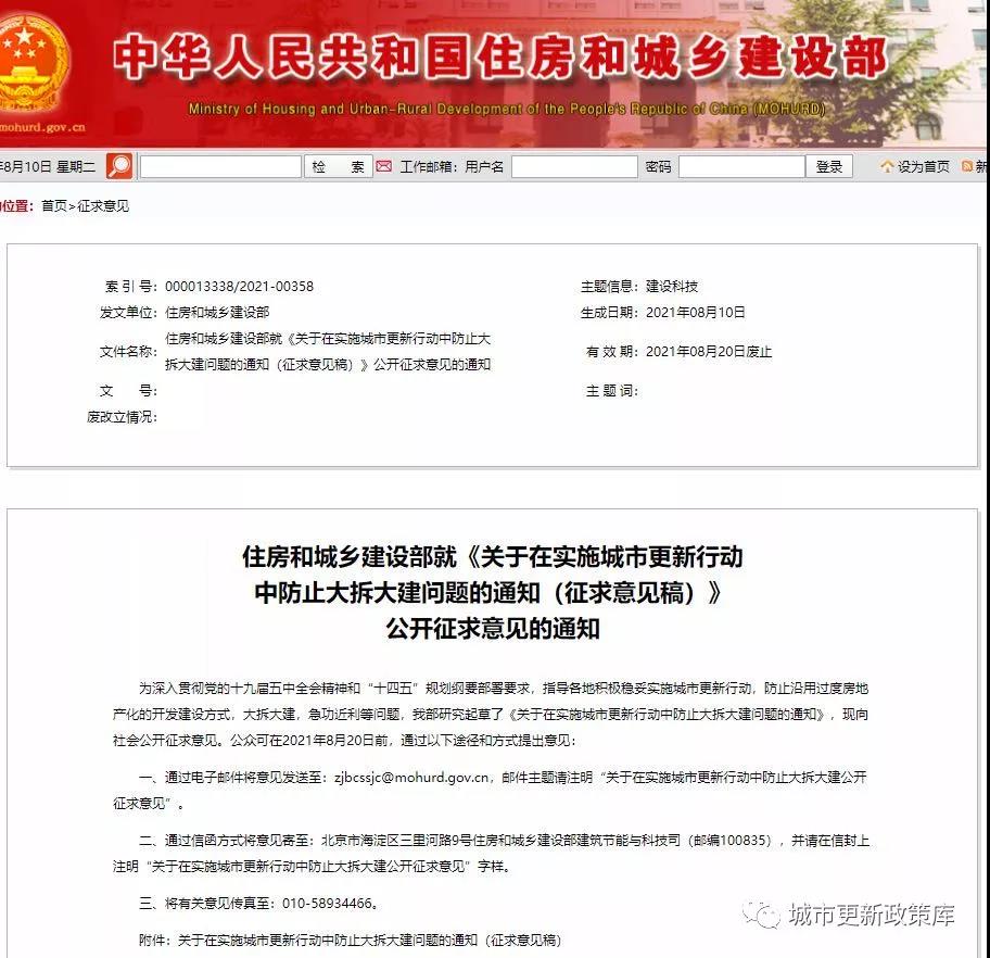 8月10日(昨天)住建部網(wǎng)站公布《關(guān)于在實(shí)施城市更新行動(dòng)中防止大拆大建問(wèn)題的通知(征求意見稿)》,釋放了收緊城市更新、防止大拆大建的政策信號(hào)。