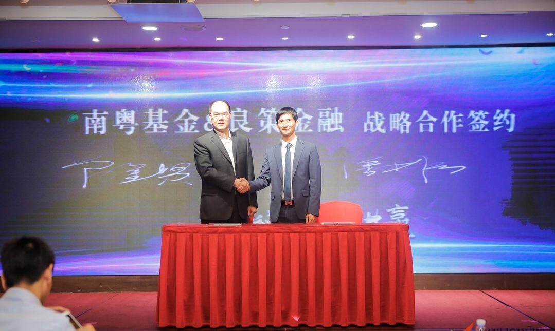 南粵基金集團(tuán)總裁曾金賢(左)與良策金融集團(tuán)董事長(zhǎng)潘梓森(右)簽署戰(zhàn)略合作協(xié)議