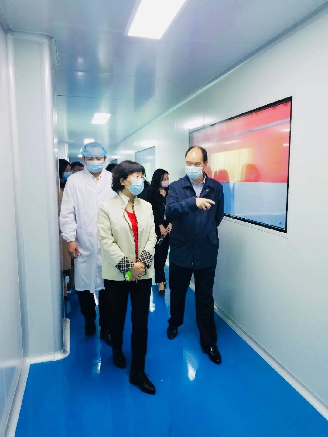 曾金賢總裁(右)陪同劉梅主席(中)考察口罩生產(chǎn)車間