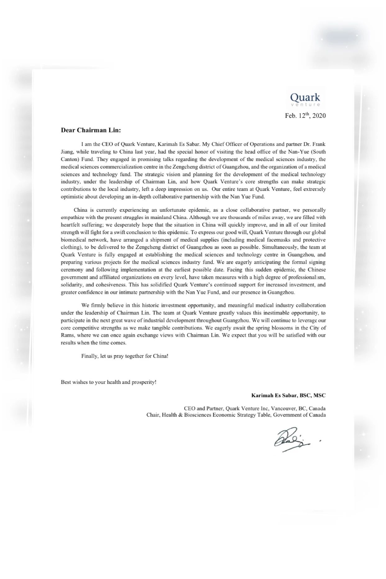 近日,廣州南粵基金集團(tuán)有限公司(簡稱“南粵基金”)收到一封特殊來信,寫信者是加拿大聯(lián)邦政府經(jīng)濟(jì)戰(zhàn)略委員會主席、加拿大自然科學(xué)和工程研究國家委員會委員、全球健康科學(xué)基金董事會董事、夸克資本(Quark Venture)首席執(zhí)行官卡瑞瑪沙巴,來信是為了聲援中國戰(zhàn)勝疫情并對南粵基金支援國家抗擊疫情的義舉和發(fā)展醫(yī)療科技產(chǎn)業(yè)戰(zhàn)略規(guī)劃表達(dá)敬意。