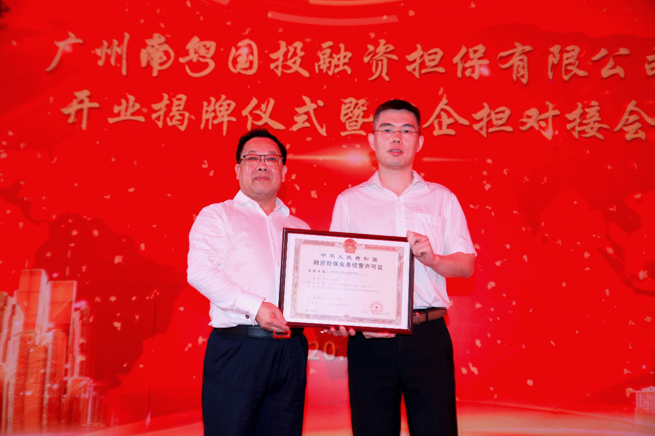 南粵基金副總裁、南粵國(guó)投董事長(zhǎng)陳曉光頒發(fā)融資擔(dān)保業(yè)務(wù)經(jīng)營(yíng)許可證