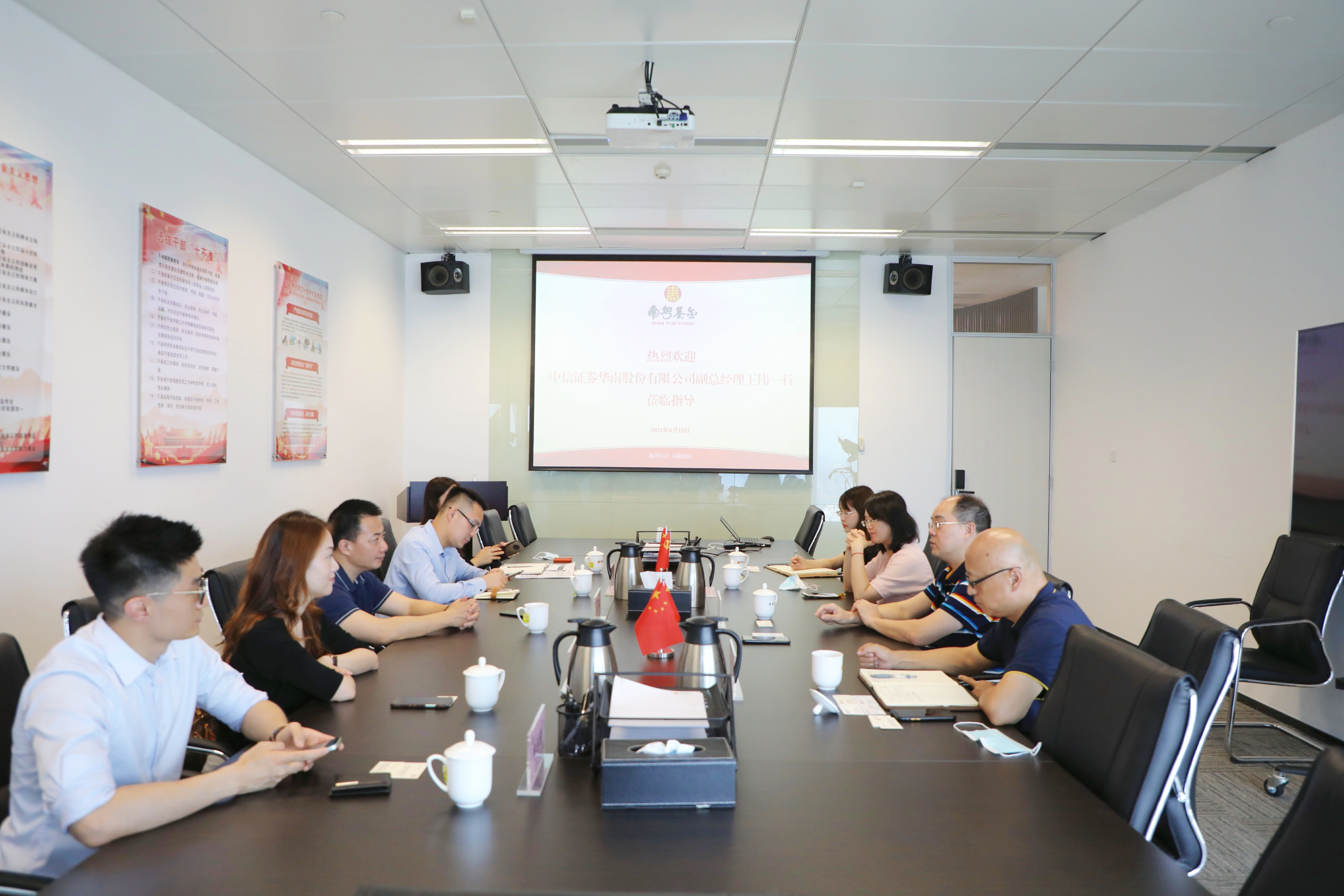 6月18日,南粵基金總裁曾金賢在集團總部會見了來訪的中信證券華南股份有限公司副總經(jīng)理王偉一行,雙方圍繞推進落實曾金賢總裁與該公司董事長胡伏云近期會談的主要精神,研究探討進一步業(yè)務合作事宜。