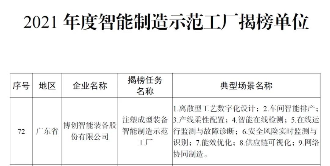 近日,國(guó)家工業(yè)和信息化部公布了2021年度智能制造試點(diǎn)示范工廠揭榜單位和優(yōu)秀場(chǎng)景名單,南粵基金投資企業(yè)——博創(chuàng)智能裝備股份有限公司(簡(jiǎn)稱“博創(chuàng)智能”)入選智能制造試點(diǎn)示范工廠揭榜單位。
