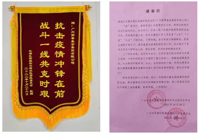 “抗擊疫情沖鋒在前,戰(zhàn)斗一線共克時(shí)艱”“疫路同行,感恩有您……”南粵基金突擊隊(duì)員們在疫情支援中的勇?lián)?dāng)、善作為,受到社區(qū)工作人員和居民群眾的好評,社區(qū)相繼送來感謝信和錦旗。