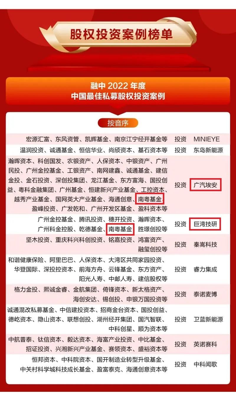 近日,融資中國主辦的“2023(第12屆)中國資本年會”公布了2022年度中國股權(quán)投資年度綜合榜單,南粵基金戰(zhàn)略投資廣汽埃安、巨灣技研等明星項目,均入選“2022年度中國最佳私募股權(quán)投資案例”。