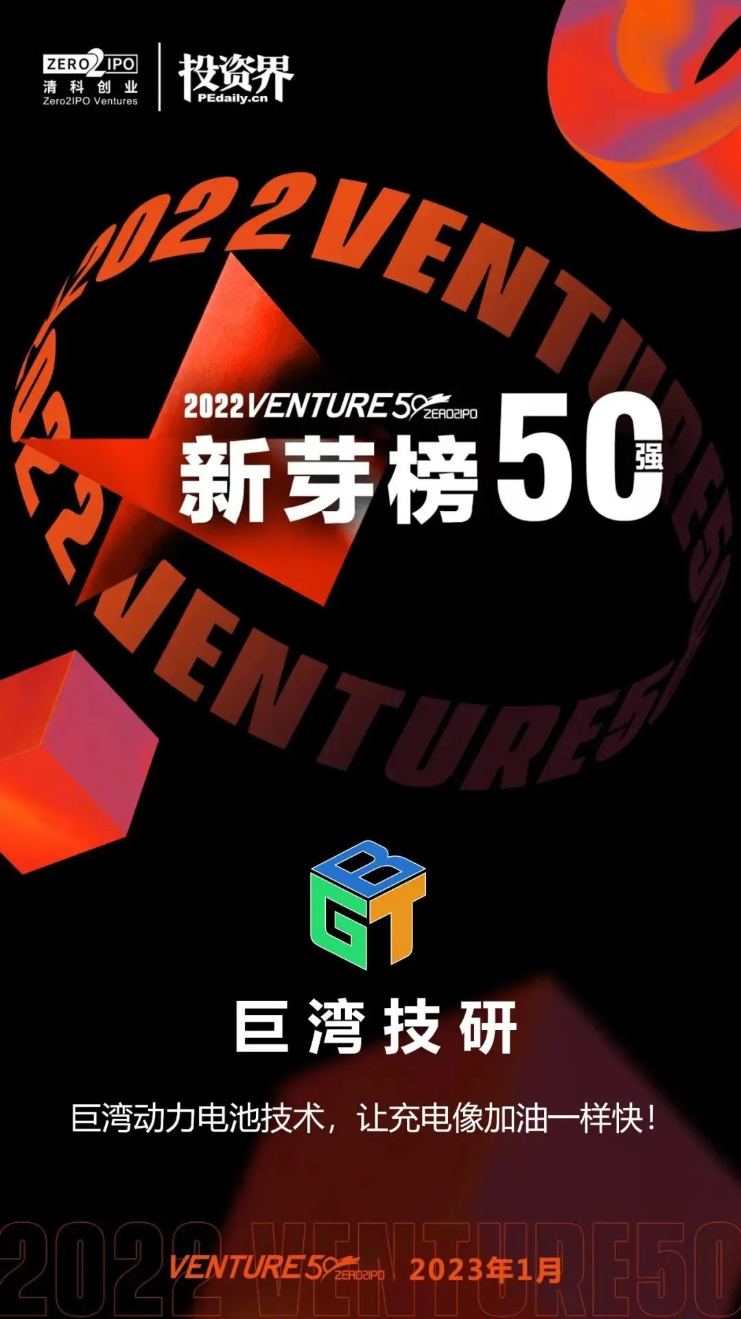 近日,由清科創(chuàng)業(yè)、投資界發(fā)起的2022Venture50榜單最終揭曉,南粵基金投資企業(yè)——巨灣技研憑借“XFC極速充電動力電池及其系統(tǒng)技術(shù)”的技術(shù)創(chuàng)新及產(chǎn)品優(yōu)勢,從3000余家參評企業(yè)中脫穎而出,榮登“2022中國最具投資價值企業(yè)50強新芽榜”和“投資界碳中和Venture50”兩大榜單。