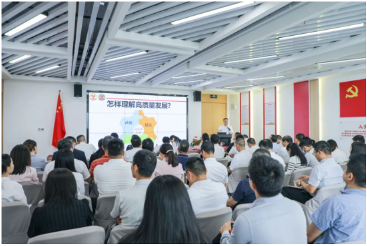 在宣講環(huán)節(jié),廣州市委黨校經(jīng)濟學(xué)教授吳兆春以《深入學(xué)習(xí)貫徹<習(xí)近平著作選讀>(第一、二卷),著力推動高質(zhì)量發(fā)展》為題,闡述了如何牢牢把握高質(zhì)量發(fā)展這個全面建設(shè)社會主義現(xiàn)代化國家的首要任務(wù)。