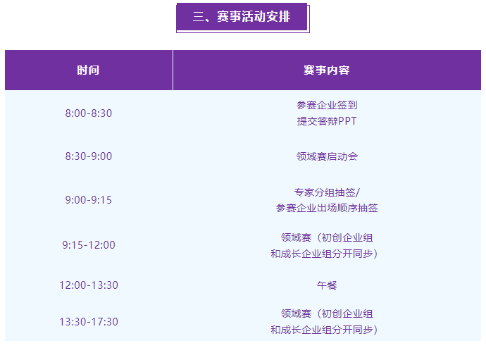 (二)新一代信息技術(shù)行業(yè)領(lǐng)域賽的參賽企業(yè)分4組,按抽簽結(jié)果決定比賽的順序,并依次進(jìn)行答辯;后比賽的參賽企業(yè)可在場(chǎng)下觀看比賽或到場(chǎng)外參與園區(qū)其他活動(dòng),等候工作人員的指引。