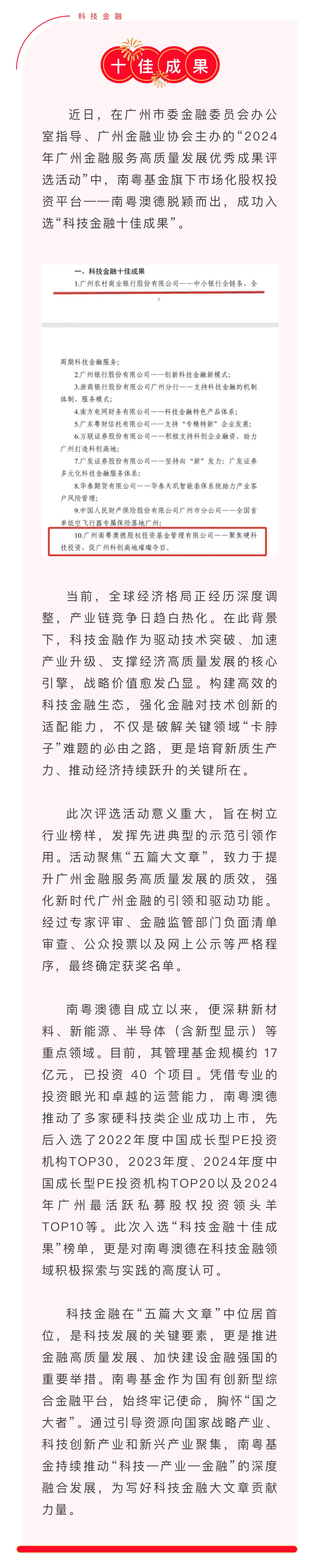 恭喜!南粵澳德成功入選“科技金融十佳成果”