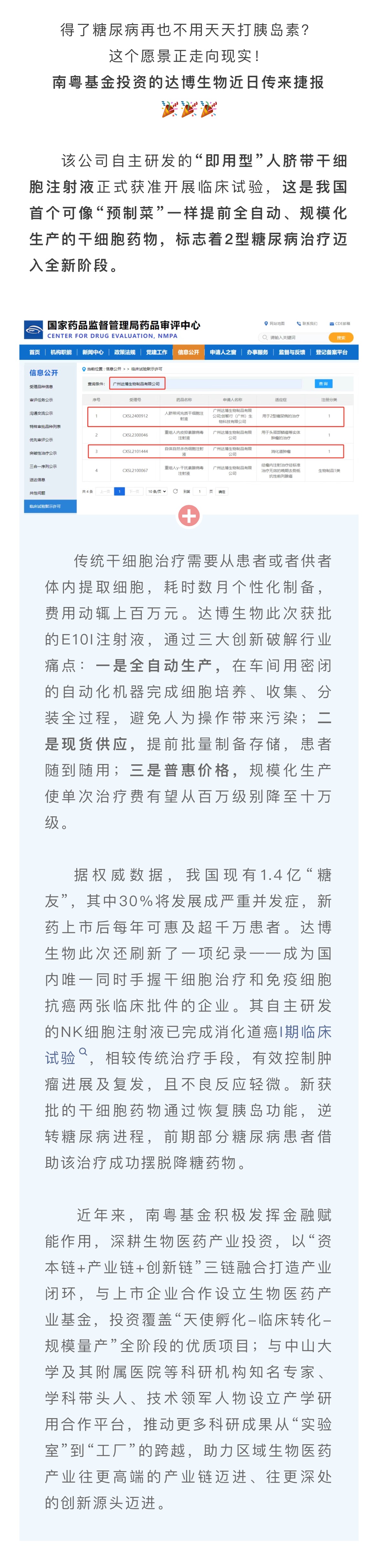 新突破!南粵基金投資項目——國產(chǎn)“萬能干細胞藥”進入臨床