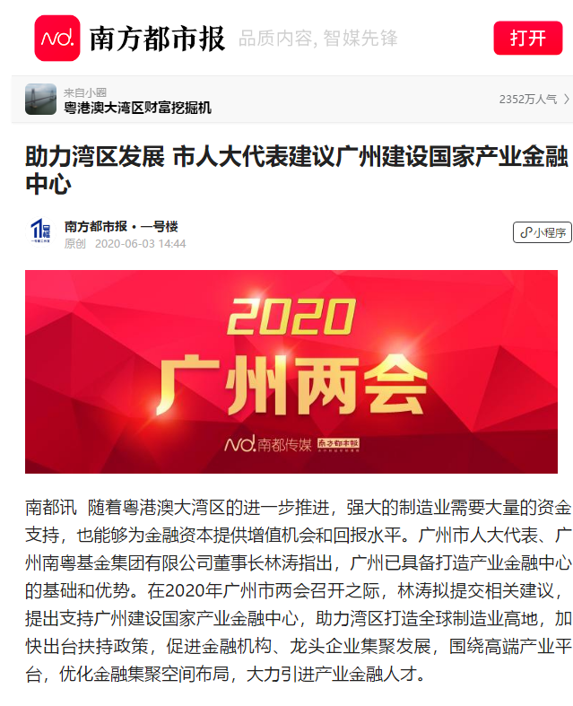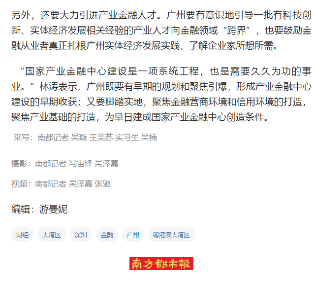 南方都市報|助力灣區(qū)發(fā)展 市人大代表建議廣州建設國家產業(yè)金融中心